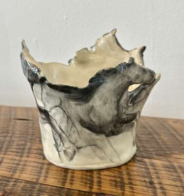 Love of horses and an intuitive understanding of their characters inspired her to draw and paint horses from early childhood. Her artistic expression over the years evolved from photo realistic portraits of the horse's physical beauty toward more abstract equine paintings that better captured their real essence and spirit. The deep understanding of their anatomy and their herd relationships that came from riding dressage and eventing add an intimacy to all her work.