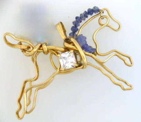 Kate's award winning sculptures have evolved into exquisite miniature works of hand crafted wire equine jewelry in sterling silver, gold and gold-filled wire. Wearable as horse jewelry, and yet still capturing the essence of the movement of the horse in her unique style.